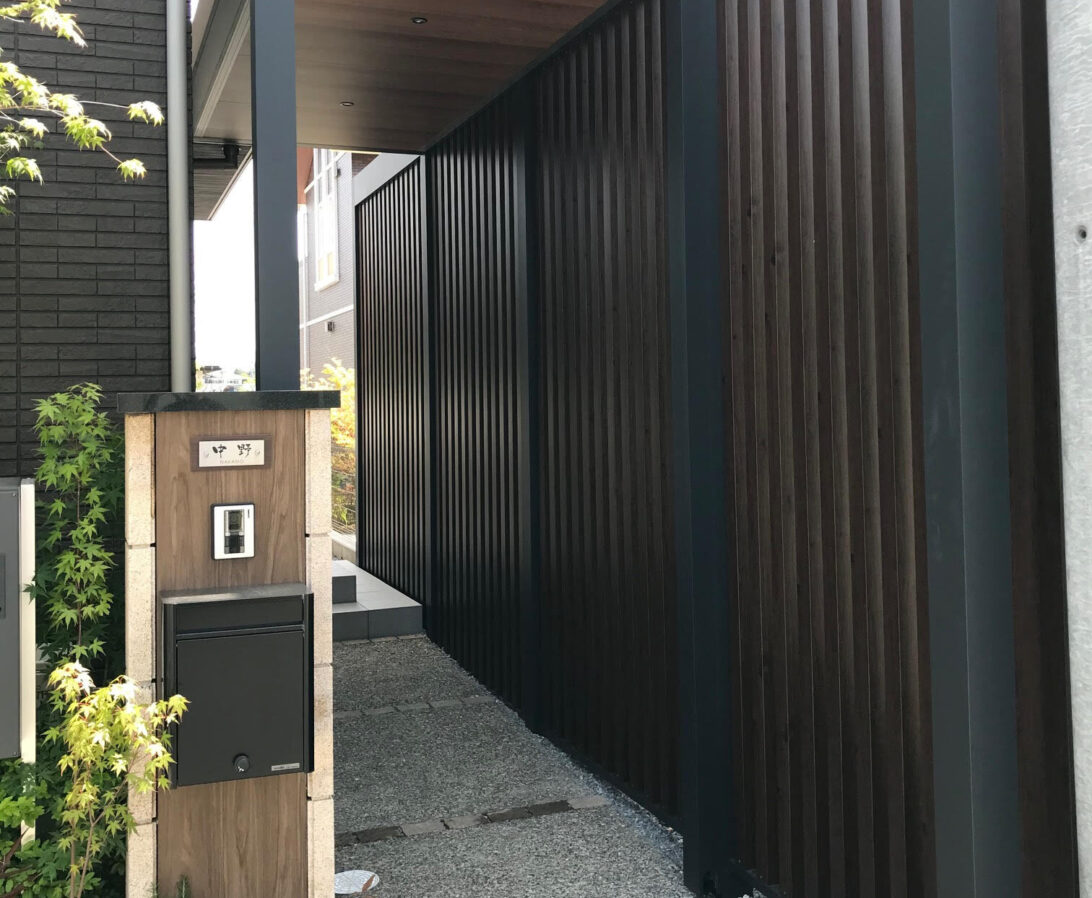 正面が抜けていることで明るさを保ちつつほどよい重厚感も取り入れ、玄関への小径を演出しています。