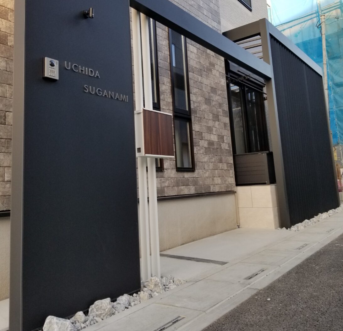 奥行きに余裕がない中で、目隠し、動線、重厚感を面とラインでうまく創り出しています。