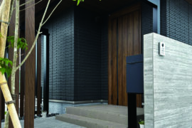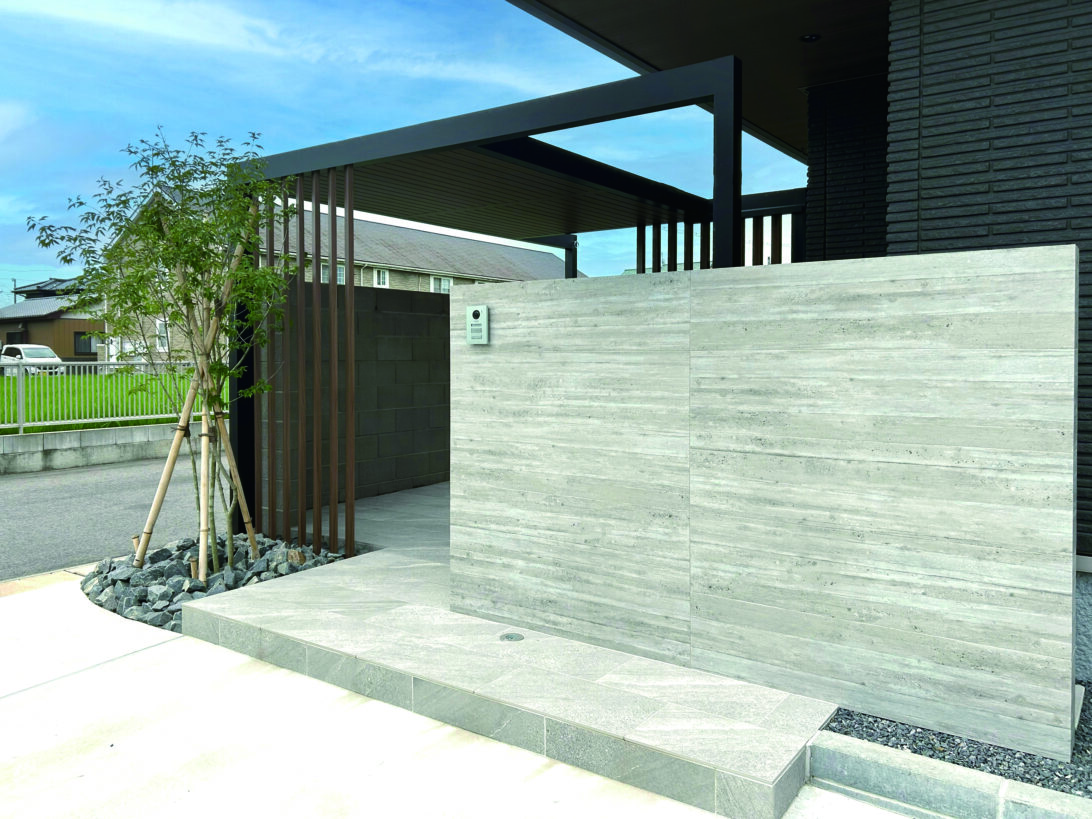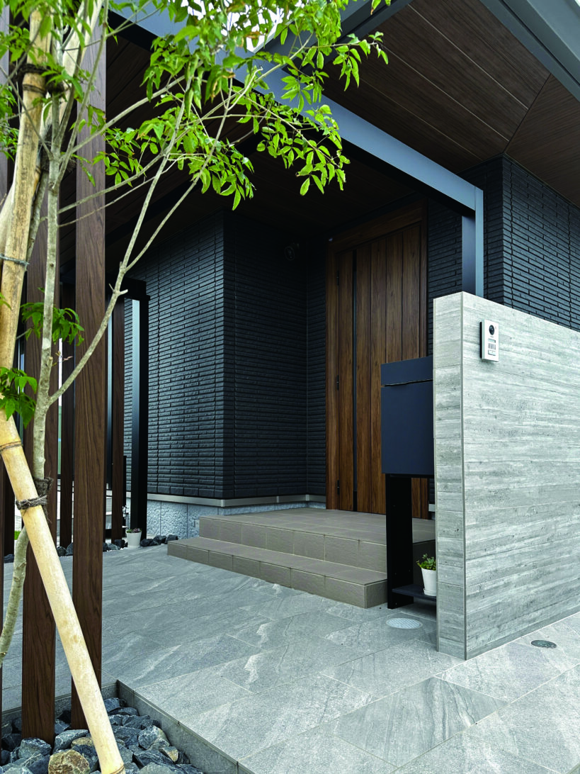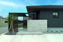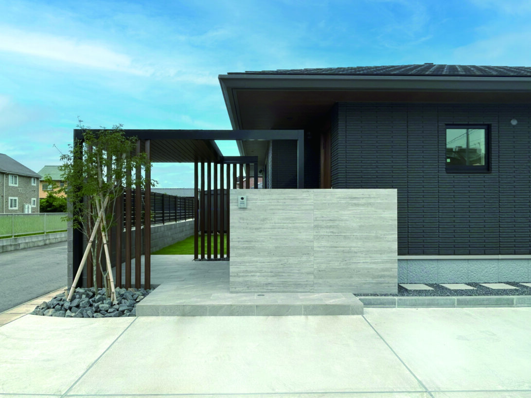平屋のシックな住宅。グレー系で馴染ませた中に、木目色が醸し出す温かみと優しさがポイント。